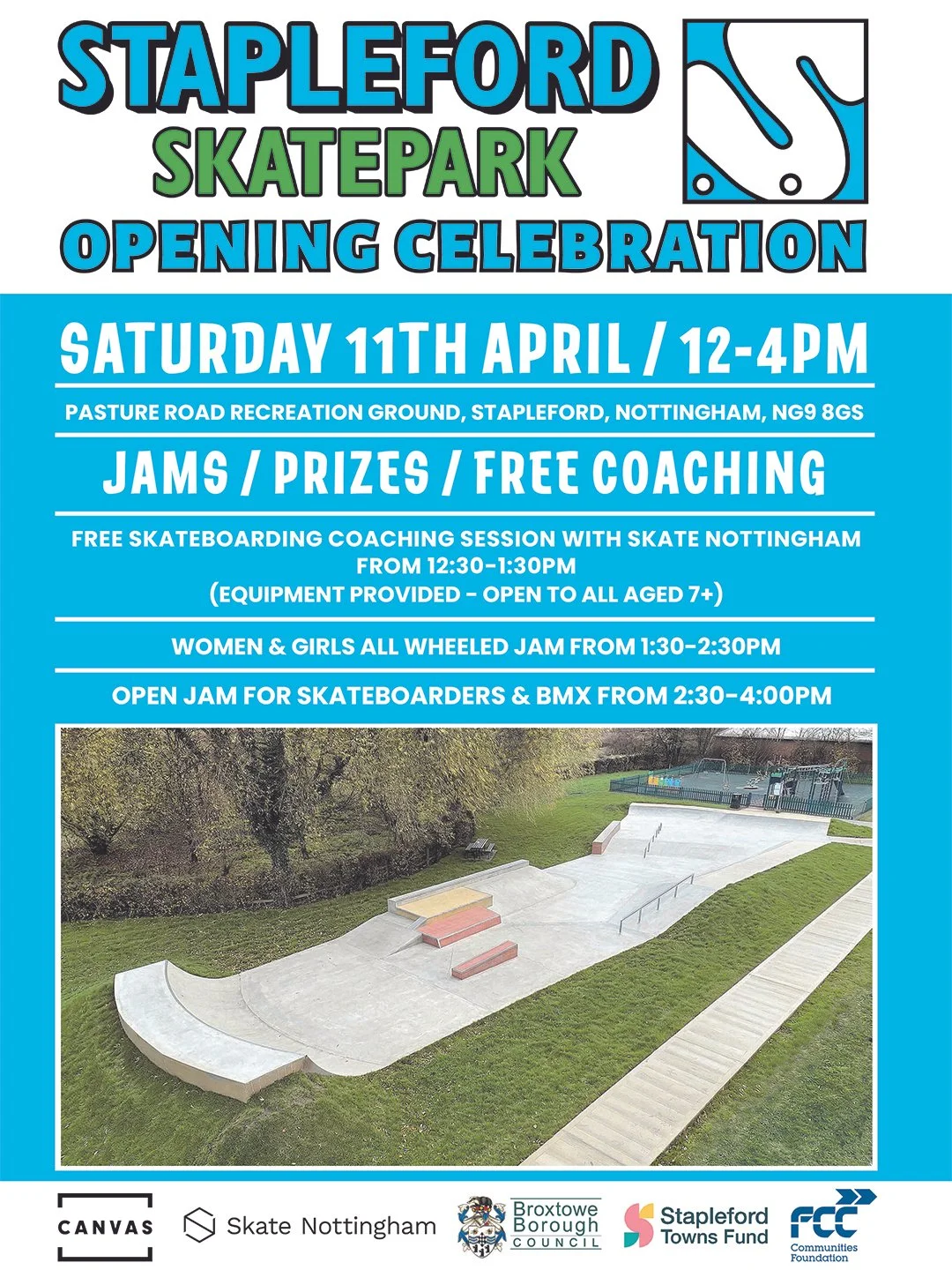 Join Canvas Skateparks, Skate Nottingham, and Broxtowe Borough Council for the official Stapleford skatepark opening!