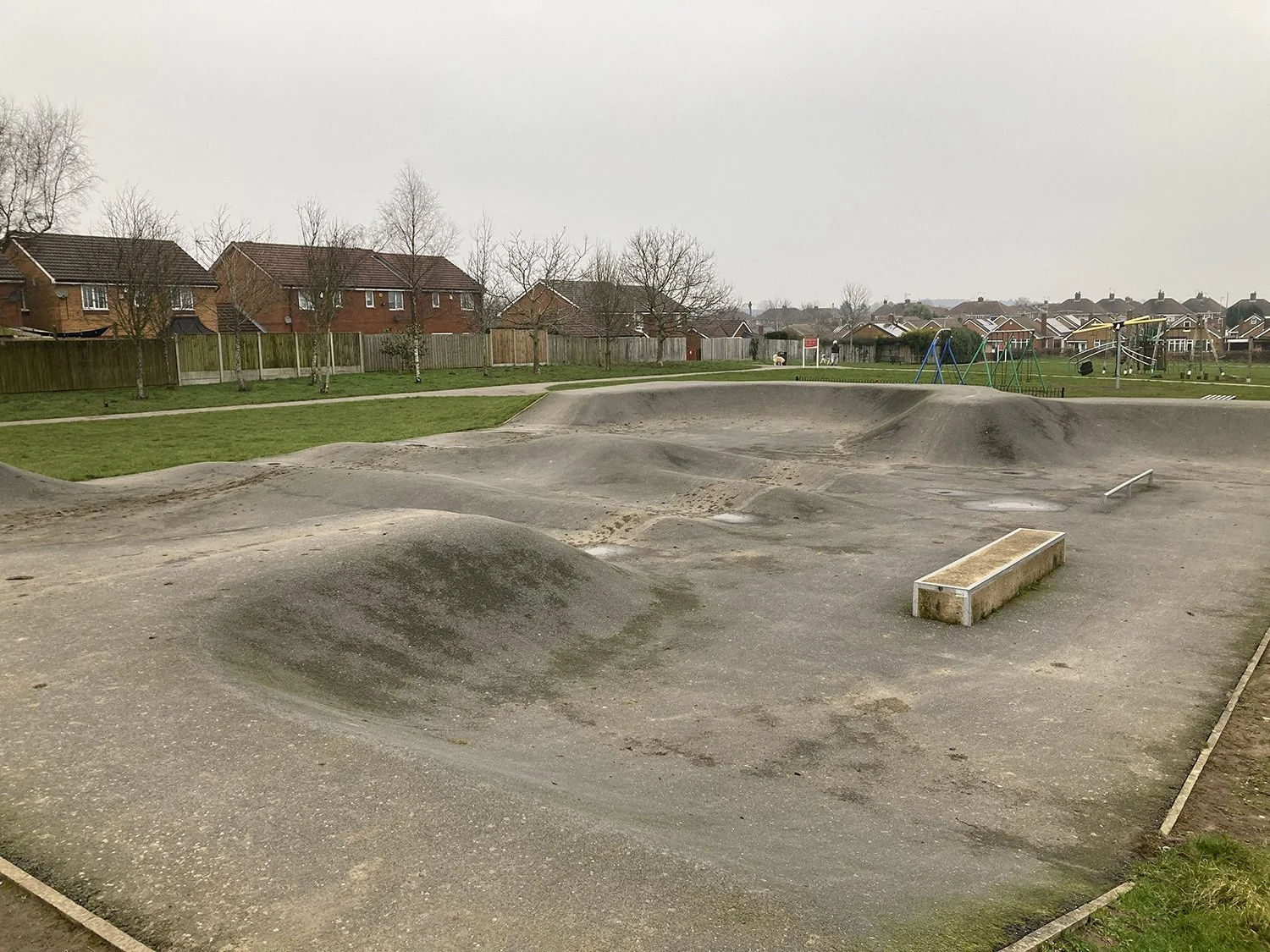 A tarmac ‘scoot park’, mainly bowled corners and pump bumps, with a small ledge & flatbar.