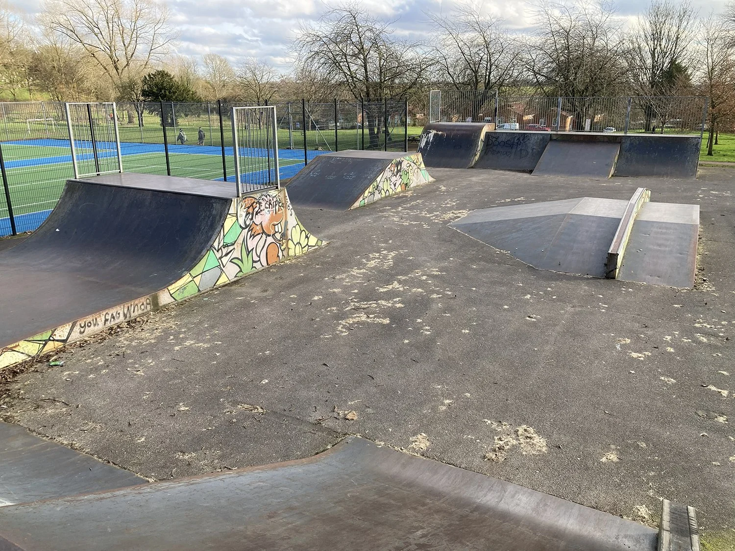 An old metal skatepark with flatbanks, quarters, a funbox, hubba and miniramp. The tarmac floor is skateable but with some cracks and bumps.