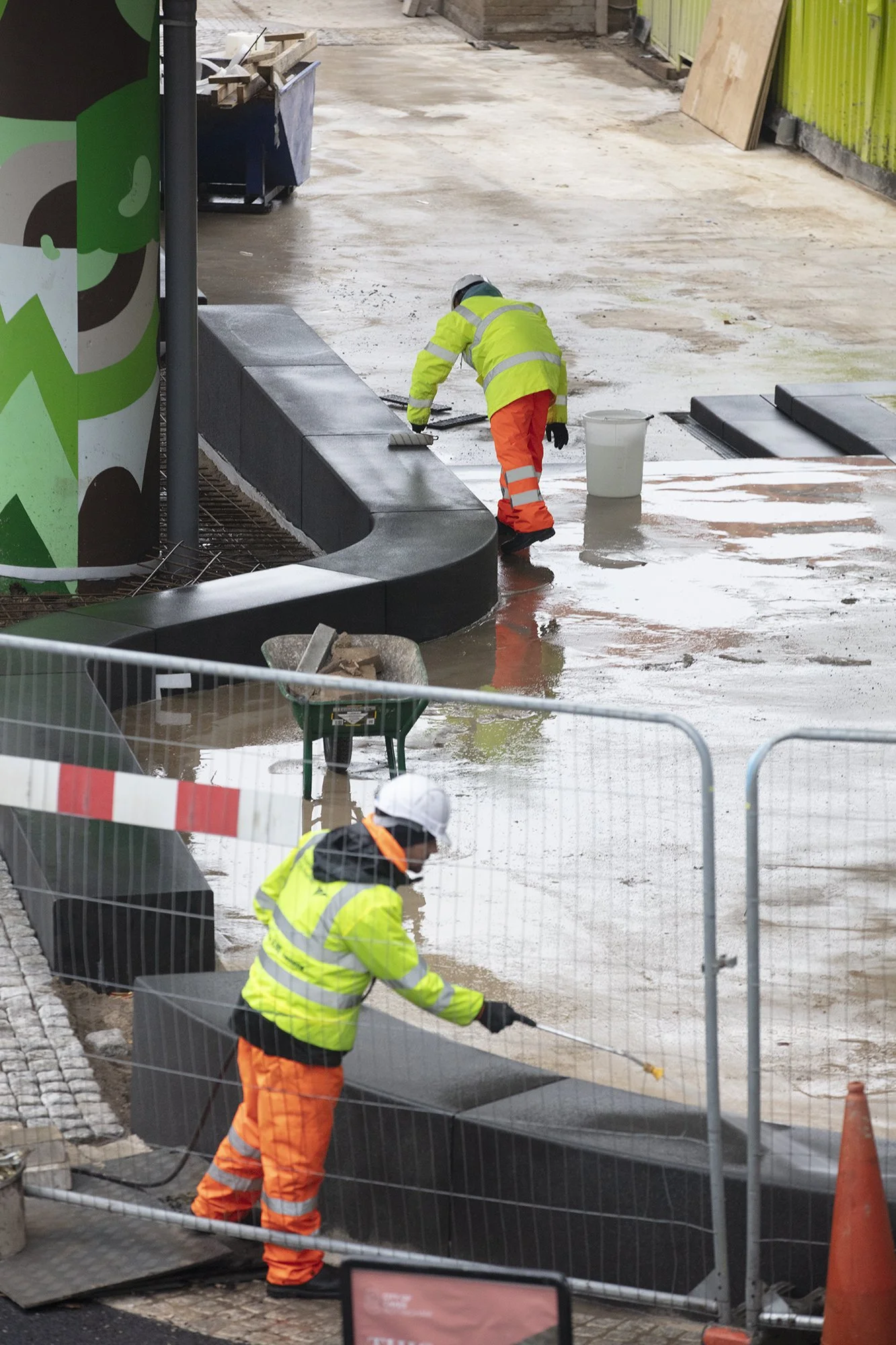 Skate Nottingham team members working alongside the city’s contractors on the last week of Tram Line Spot’s build.